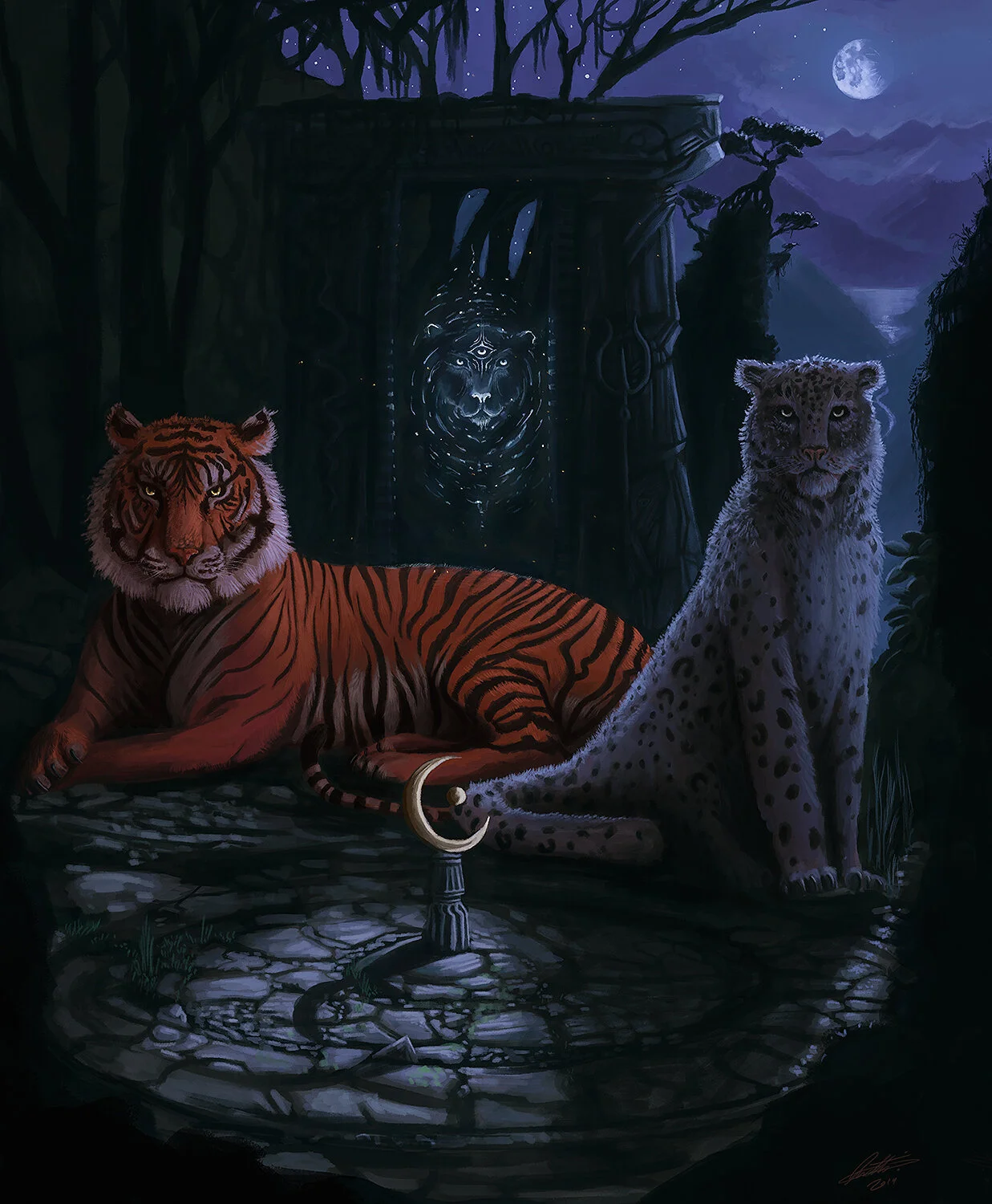 Beyond them both stands another arch... sinking slowly into the ground, and as your peer into its door, two bright eyes emerge with an energy like spiralling starlight, forming a face of a third feline. Upon its forehead opens another eye... and so you face an ancient Jaguar...
